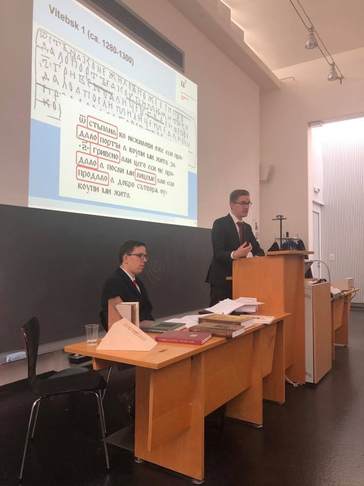 Dr. Simeon Dekker (Universität Bern) hält einen Vortrag zu den Birkenrindentexten der westlichen Rus'.