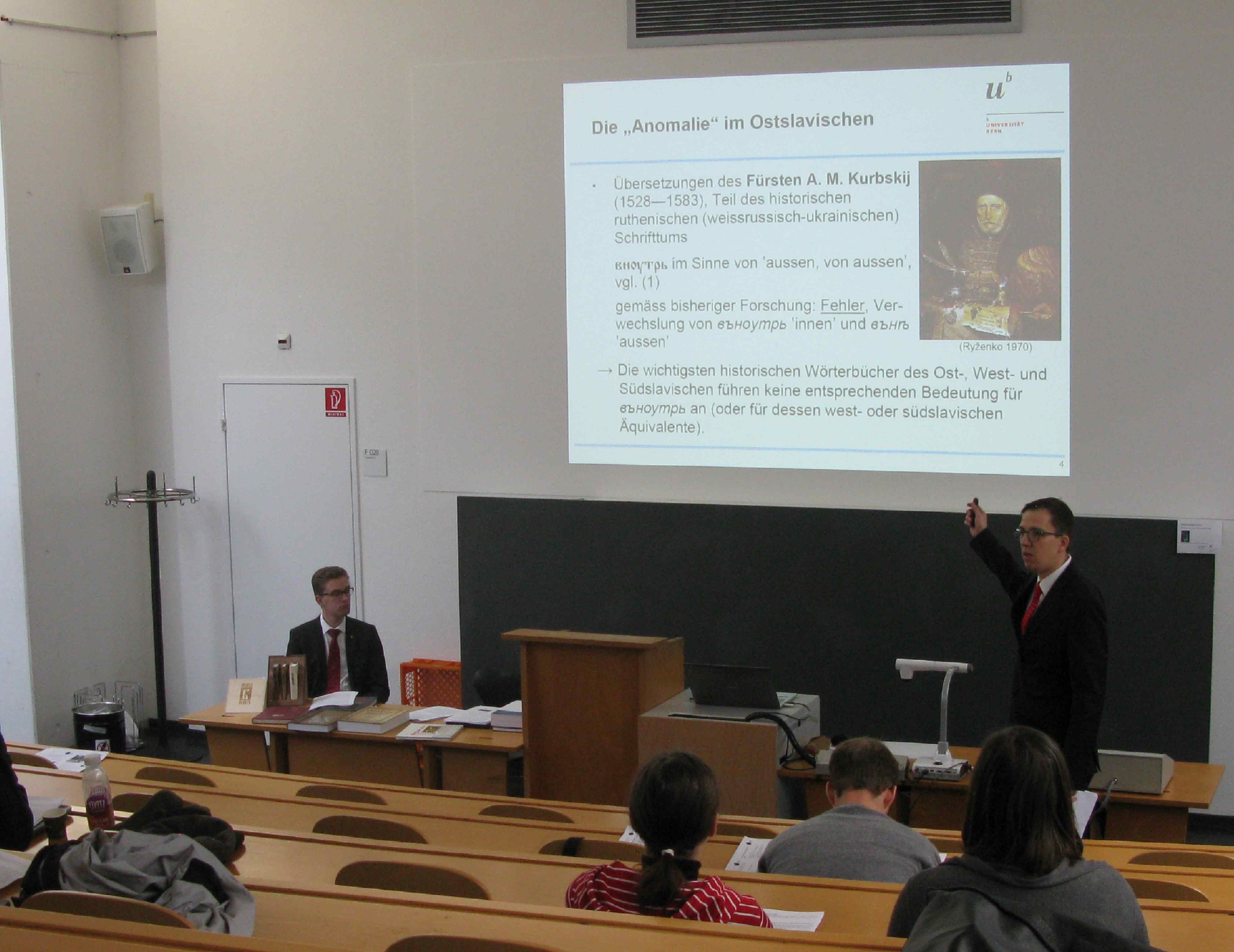 Dr. Elias Moncef Bounatirou (Universität Bern) hält einen Vortrag zu einer scheinbaren lexikalischen Anomalie in historischen ruthenischen (weissrussisch-ukrainischen), grossrussischen, polnischen und südslavischen Texten.